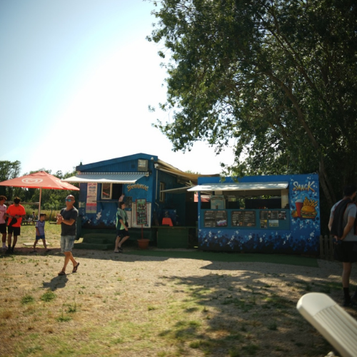 Tables ombragées et snack sur place pour manger facilement en famille ou entre amis.